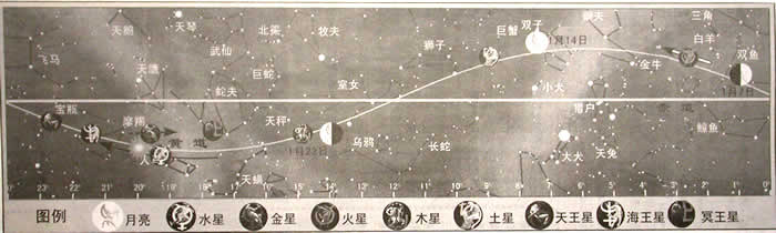 页底图显示出太阳及大行星在本月15日的视位置。对于水星、金星和火星则指示出它们从月初到月末的视运动轨迹。对于月亮则指示出它在上弦、望、下弦时的视位置