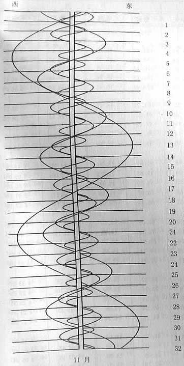 说明:图中的两条平行竖直线之间的距离表示木星的视直径。各卫星相对于木星的位置用正弦曲线表示,四条曲线自里向外依次代表木卫一、木卫二、木卫三和木卫四。纵轴所标数字为日期,图中的平行横线为每日北京时间20时的时刻,横线于正弦曲线的交点为此时各卫星的位置。横线于横线之间的距离是一天,根据比例可知任意时刻卫星的位置。