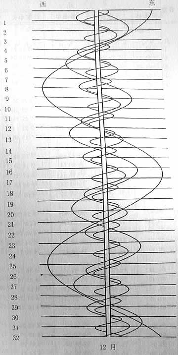 说明:图中的两条平行竖直线之间的距离表示木星的视直径。各卫星相对于木星的位置用正弦曲线表示,四条曲线自里向外依次代表木卫一、木卫二、木卫三和木卫四。纵轴所标数字为日期,图中的平行横线为每日北京时间20时的时刻,横线于正弦曲线的交点为此时各卫星的位置。横线于横线之间的距离是一天,根据比例可知任意时刻卫星的位置。