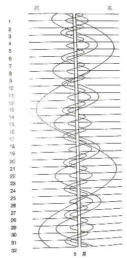 说明:图中的两条平行竖直线之间的距离表示木星的视直径。各卫星相对于木星的位置用正弦曲线表示,四条曲线自里向外依次代表木卫一、木卫二、木卫三和木卫四。纵轴所标数字为日期,图中的平行横线为每日北京时间20时的时刻,横线于正弦曲线的交点为此时各卫星的位置。横线于横线之间的距离是一天,根据比例可知任意时刻卫星的位置。