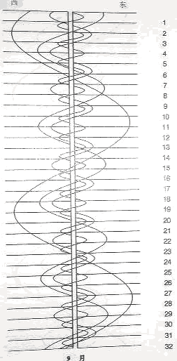 说明:图中的两条平行竖直线之间的距离表示木星的视直径。各卫星相对于木星的位置用正弦曲线表示,四条曲线自里向外依次代表木卫一、木卫二、木卫三和木卫四。纵轴所标数字为日期,图中的平行横线为每日北京时间20时的时刻,横线于正弦曲线的交点为此时各卫星的位置。横线于横线之间的距离是一天,根据比例可知任意时刻卫星的位置。