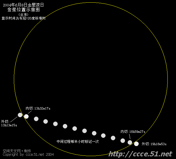 在入凌前,要把表对得尽量准确,应尽可能的调整好极轴,并把东西线画好(或把观测用纸调整好),把太阳上的可见黑子描绘于观测用纸上。描图时,要注意手不要压屏幕,头不要碰屏幕,尽量保持屏幕稳定,增加准确度。描完黑子后,就进入了准备的最后阶段。这时,眼睛要目不转睛地注视日面的东边缘,当看到圆滑的边缘像日食似的刚开始缺了一小块时,意味着凌日开始了。应立刻记下时间,这便是入凌时的外切时间(日面东边缘与金星西边缘外切的时刻),并描出外切的位置。同样,也应记下入凌时的内切时间(日面东边缘与金星东边缘内切的时刻),描出内切的位置。这时,整个金星已经完全处于太阳的圆面之内了。从此刻开始,要每隔半个小时把金星的位置在同一张观测用纸上描绘一遍,在每个位置上注明时间,直至即将出凌。在此过程中,您可以尽量欣赏这百年一遇的奇观,看看是否能看到光晕。整个凌日过程将持续6个小时,为了保证仪器的安全,不要总是让仪器工作,同时也要防止中暑。在休息时,盖上镜头盖,关掉电跟(如果有的话),尽可能的让仪器冷却。由于投影观测不用深暗的滤光片或根本不用,目镜片的温度常达到几百度!因此要谨防烫伤和镜片炸裂,不要用手靠近目镜。