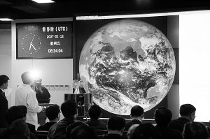 1月12日下午,在中国气象局国家卫星气象中心,人们在观摩风云二号D气象卫星获取的第一套图像。当日,中国气象局成功获取风云二号D气象卫星的第一套图像,标志着该卫星与地面应用系统对接成功,星地系统工作正常。风云二号D气象卫星于2006年12月8日在西昌卫星发射中心成功发射。
