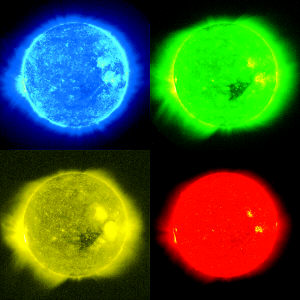 2006年12月20日,日地关系观测卫星于12月4日传输的首批太阳图片。卫星采用不同色素测量了太阳不同地方的温度,图片显示太阳不同地方存在很大的温度差异,从左上部顺时针方向观看图片,温度依次为:蓝色光环一万摄氏度,绿色光环一万五千摄氏度,红色光环两万五千摄氏度,*光环六万至八万摄氏度。