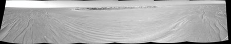 经过在火星表面漫长而复杂的跋涉,“机遇”号终于结束了长达20个月的长途旅行,顺利到达目的地,开始拍摄、传送这个巨大撞击坑的照片。最初发回的照片显示,陨坑外围暴露于地表之上的岩层形成高低不平类似墙壁一样的屏障,底部被沙丘覆盖,正如研究人员所知道的那样;远处的墙壁大约在半英里之外。