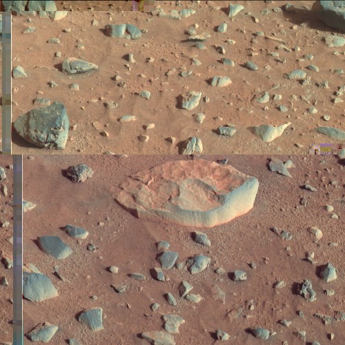 这是一张由“勇气”号拍下的火星岩石的合成照片。从照片上看,这块被命名为“白船”的岩石有三种颜色:红色、绿色和蓝色。之所以命名为“白船”是因其形状如一艘船而得来的。