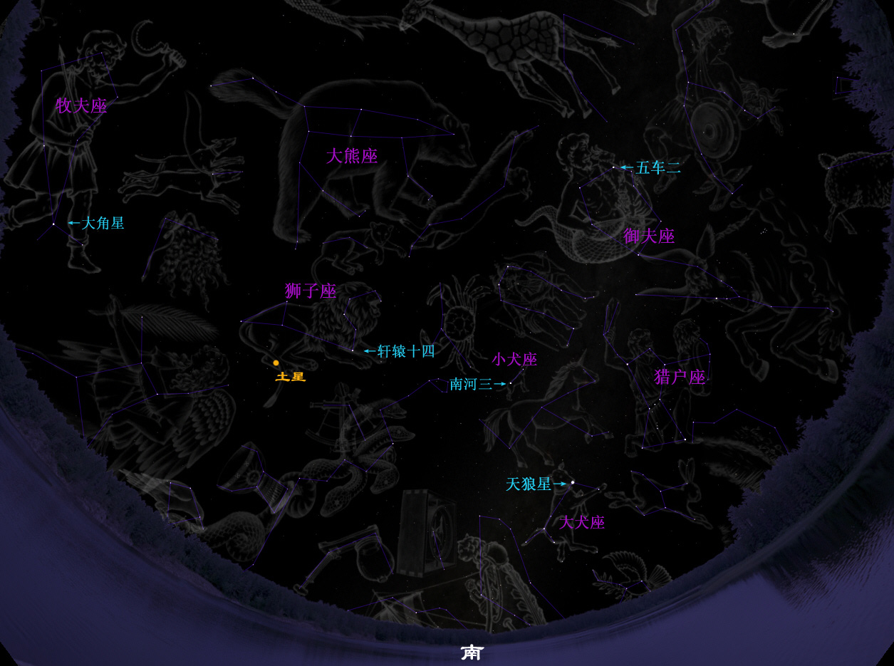 天最亮的恒星天狼星指示着它的方位。大犬座上方是小犬座,0等星南河三是该星座最亮的星。冬夜的另一个著名星座——御夫座此时就像一个无变形的风筝放飞在西北方的夜空中,0等星五车二是最亮的一角。