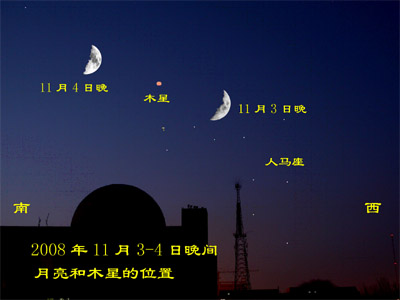 北京时间11月4日早6时,天空中将上演“木星合月”的天象,遗憾的是国内的观测者无法观测,因为此时它们都在地平线以下。但在3日和4日的黄昏,在西南方的天空里可看到木星和月球“亲密会面”的情景,如果天气晴朗,有兴趣的天文爱好者可以大饱眼福。