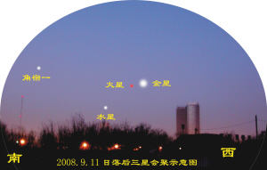 9月中旬的日落黄昏,如果天气晴朗,遥望西部低空,会看到三星会聚的景观。就国内大部分地区而言,最佳观测时间在18:30至19:00之间。 明亮的金星,泛红的火星,银色的水星,三星相聚在一起。”江苏省天文专家严家荣老师介绍,这种美景只有30分钟左右,有意观测的天文爱好者要把握好时机才行。