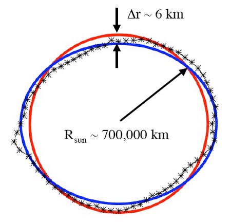 在美国宇航局拉马第高能太阳光谱成像探测器(以下简称RHESSI)帮助下,科学家对太阳的圆度进行了精确度空前的测量。测量结果显示太阳并不是一个完美球体。在活动较为剧烈的年份,太阳会形成一层薄薄的“香瓜皮”,在很大程度上增加了其外观的扁率,此时的赤道半径略大于极半径。其研究成果刊登在《科学快讯》上。