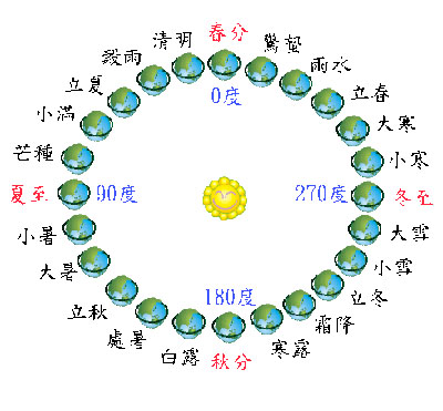 道上运动,一个回归年运行一周。太阳在黄道上的位置用黄经表示,从春分点0点开始,每隔15度 为一气,其中十二个气叫作节气,另外十二个气叫作中气。节气和中气相间排列,一年共二十四,每个月有一个节气和一个中气。在古代,这二十四个等份(每个月中)前面这个叫“节”,下一个等份叫“中”,又叫作“中气”。时间长了人们把这个就简化了,把二十四个等份统统叫作“节气”。 从二十四节气的形成来看,有明显的区域性特点,因为二十四节气形成于黄河的中下游。