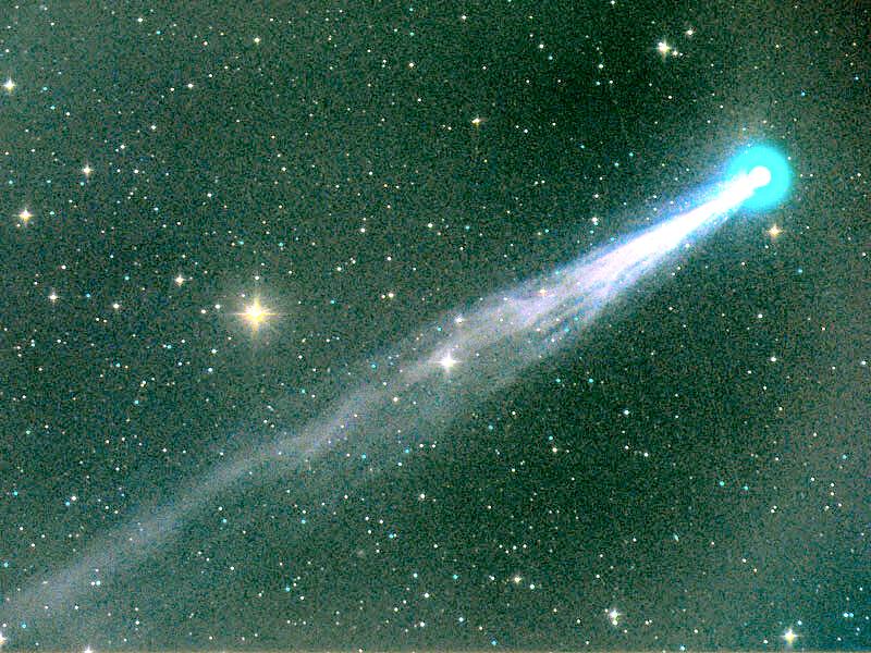这幅壮观的彗星彩照是今年9月30日拍摄的,右上方的球形“彗发(即,彗星的大气)”包裹着不大的彗星本体——彗核,在背太阳方向(往左下)有复杂特征的长长彗尾。