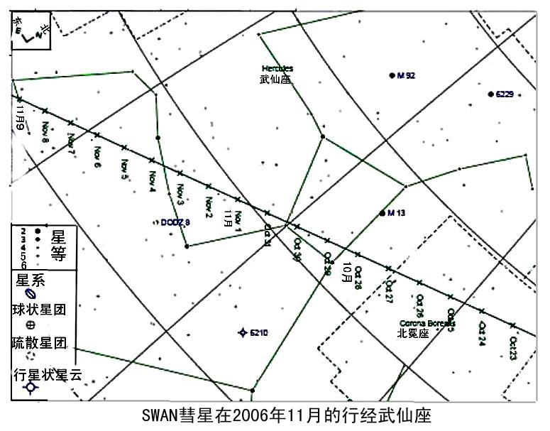 它在9月28日运行到离太阳最近到0.783天文单位(天文单位是地球到太阳的平均距离——1.5亿公里)。由于受到的太阳照射更强,从“脏雪球”彗核蒸发出来的物质更多,彗发和彗尾更发育,彗星更亮。然后远离太阳,并向地球靠近,10月27日从离地球约1天文单位交错过去。它10月24日突然增亮到肉眼可见。它将从北冕星座移向武仙星座,黄昏时在西方太空,不过,需要用望远镜才能够看到。以后它就越来越远去了,除非它再突然增亮,否则就越来越黯淡,彗发和彗尾逐渐消失,仅留下赤裸的彗核,再后,连大望远镜也观测不到了。