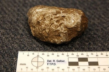 2日晚上,这个高尔夫球大小,足有一个汤罐重的物体砸到一所房屋后嵌入一面墙里。被派往现场的联邦官员表示,它并不是从飞机上坠落的物体。3日,警方将这个神秘物体展示给公众,它是一块表面粗糙,闪烁着金属光泽的物体。警察罗伯特·布莱特曼说:“我们对这个神秘物体非常感兴趣。它相当与众不同。我从事这个职业多年来从没见过像这样的东西。”他表示他希望尽快鉴别出这个物体的来源,但他婉言谢绝了他寻找的负责查证这个神秘物体的机构的名称。