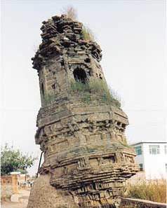 绥中斜塔 坐落在辽宁省绥中县前玉镇的斜塔,建于辽代,砖砌3层,八角形,塔高10米。该塔塔身向东倾斜已达到12度之多,大大超过比萨斜塔的斜度。