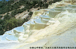 距香格里拉县城101公里的三坝乡,是纳西族的居住地。在其辖区内的白地村,有一处很奇特的地质景观,即名为“白水台”的泉华台地。在1995年穿越哈巴雪山徒步探险前,我们曾在白水台边上的乡村小客店里住过一宿。那是我第一次到白水台。当时我们用了两个小时仔细欣赏了这处面积约2平方公里的泉华台地。纳西语称白水台为“拜卜芝”,意为“不断长大的花”。由碳酸钙生成的白色泉华形成层层叠叠的台阶,组成大大小小无数个半月形水池,随山势自然而下,仿佛山中梯田,又如片片新月,从不远处山洞中流出的泉水,清盈盈地在台地上四处流淌……