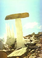 冰川周围嶙峋的角峰,经常不断地崩落下岩屑碎块。如果崩落的岩块较小,在阳光下受热增温就会促进融化,结果岩块陷人冰中,形成圆筒状的冰杯,进而形成冰面湖。如果较大体积的岩块覆盖在冰川上,引起差别消融,当周围的冰全部融化了,而大石块因为遮住了太阳辐射,其下的冰没有融化,就能生长成大小不等的冰蘑菇。