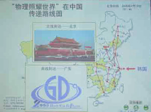19时整,电子邮件从韩国到达上海,大屏幕上显示着电子邮件的内容:“46亿年以来,地球上背着太阳的一面总是黑暗的,是强大的电能变成光,从此把地球照亮。”随后,光信号经过我国34个城市,汇总到北京后传向下一站俄罗斯和印度。