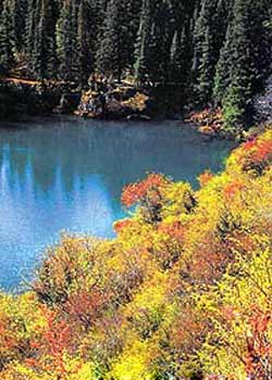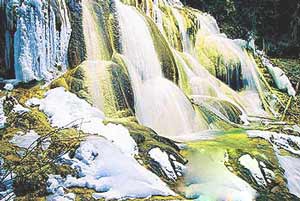 自然之子的牟尼沟 牟尼沟虽不像九寨沟那么出名,但她的“天生丽质”已经倾倒了无数捷足先登者。如今逐渐为世人所知的后寺沟彩池、二道海温泉、扎嘎瀑布等景观都是分布在牟尼沟中。 水下花海可以说是牟尼沟湖泊景观中最为奇特的景观。一种漂浮在水中或自水底蔓生,大小、形状、颜色极像腊梅的不知名水草从几米或十几米深的湖水中冒出水面,然后从水底