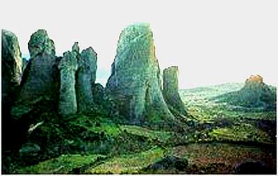 梅特奥拉石林 1000多年以来,在希腊北部品都斯山一些优美石塔顶上的修道院里,修士们一直过着平静、孤寂的生活。 在6000万年前,这个地区是一岩石海床,后经强烈的地运动而抬升,同时产生崩裂。 该处的岩石如今被称为梅特奥拉。它们缓慢地被水、风、热和冰冻所侵蚀,留下24个庞大的石柱。 据人们推测,石柱侧面上的水平印迹是古代的波浪所形成的。有些高出平地550米,相当于多伦多的加拿大国家电视塔。 这就是梅特奥拉号称“布腊的石林”。