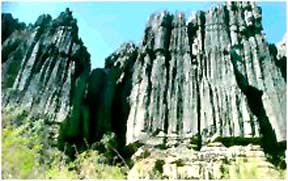 钦吉岩地 在马达加斯加北部有一个名叫钦吉的岩地,呈刀削般针状。当地的马尔加什人之所以取“钦吉”这个名字,是因为人们碰击这些岩石时,岩石会发出一种沉闷的当啷声,即当地人所说的”钦吉”声。据说因为这种针状体排立得密密麻麻,使人无法插足其间。 钦吉岩地的岩石如此尖利且参差不齐,以致人们走在上面时最坚韧的皮靴也很快被撕成碎条。如果踏空一步,则可能会将整条腿的皮擦掉,或把一只手臂或一条腿的肉弄穿,露出骨头。 这里的岩石属石灰岩,多少年来大雨侵蚀了那结较软的岩石,只留下硬针状岩直立于地面之上。水渗入岩层形成了地下河流,在地表下挖空形成了深洞和水道。