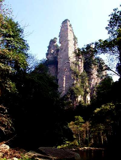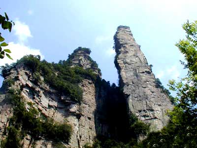 金鞭岩,相对高度350米,上细下粗,顶端尖削,宛如一根长