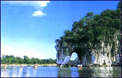 象鼻山位于桂林市东南江西岸,因酷似一只站在江边伸鼻豪饮江水的巨象而得名。象鼻山是桂林山水的代表,桂林城的象征。桂林乃至广西地方产品多以象山作为标记。象鼻山海拔 200 米,高出水面 55 米,长 108 米,宽 100 米,山体面积 1.3 公顷,是由 3.6 亿年前海底沉积的纯石灰岩组成的。 在象鼻山的象鼻与象腿之间,有一东西穿洞。高大明亮的洞底,旅行家徐霞客曾有描绘:“飞崖自山顶尺跨,北插中流,东西俱高剜城门,阳江从城南来,流贯而合於漓,上既空明如月,下复内外莹波”。“象山水月”之称以此传世。每当月朗清风,水平如镜之夜,水月洞倒影,酷似一轮皎月浮江,江中二圆月并浮,一幅“水底有明月,水上明白浮,水流月不去,月去水还流”的绝妙意境。