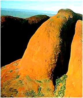 奥尔加山 澳大利亚中部的奥尔加山不知是从哪里冒出来的。由于它好像是从朦胧的海上升起来的红色岩岛,因此被称为“岛山”。最初,它们只是海底下的岩块,渐渐地被捣成卵石和巨砾,与沙子粘结在一起。 大约5亿年前,地壳运动将这些岩石抬升到海面上,同时向侧面倾斜。风和水将它们侵蚀成我们看到的穹丘。