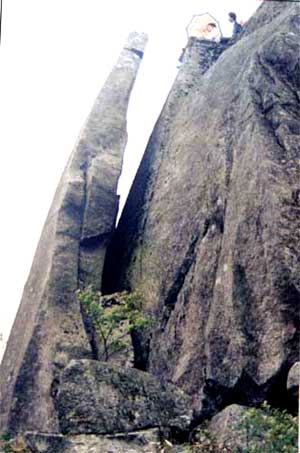 试剑石,位于湘鄂赣三省交界处海拔1511米的幕阜山主峰龙山龙王峰。传说,仙人吕洞宾与黄龙寺僧慧禅法师在此斗法试剑,剑开巨石,缝宽2米,长约10余米。试剑石侍山而立,云浇雾罩,为黄龙山第一景观。
