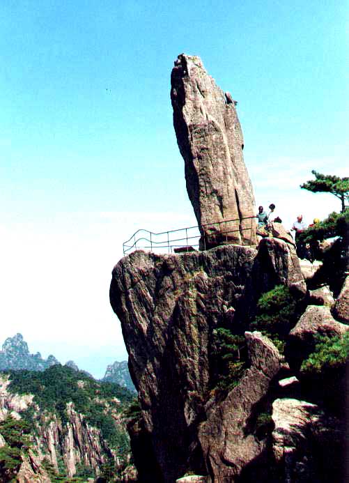 飞来石位于光明顶西北方,相距近1公里。此石高12米,宽8米,厚1.5~2.5米,重约360吨,形态奇特,如此巨石却被竖立在一块长约12~15米、宽8~10米的平坦岩石上,令人惊叹不已!游人站在平台边缘上凭栏揽胜,对面的双剪峰、双笋峰就像一幅神奇的泼墨山水画。地质学家认为,飞来石这一奇观是地质变化过程中形成的,真可谓天设地造。