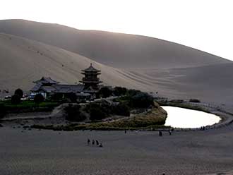 月牙泉 在甘肃敦煌南郊,有一处独具风采的沙漠奇景——鸣沙山与月牙泉。鸣沙山因其山上的积沙骚动有声而大名鼎鼎。月牙泉,则因形似弯弯新月而芳名远扬。千百年来,它们形成了浩瀚沙海中的奇妙景观,和敦煌莫高窟的壁画一样,誉满天下。