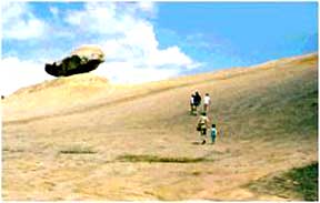 当33亿多年以前,这个过程正在形成时,花岗岩发生了破裂。裂缝经风吹雨打逐渐扩大。同时,岩石的外“壳”开始以大石板状分离。结果有些形成为巨大的“鲸鱼背状”山脉;其他的则成了平衡岩,看起来好像一阵风就会将之吹倒,然而它们已经竖立数千年而没有倒下。