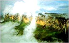 罗赖马山 委内瑞拉以及东面诸国的高地形成了亚马孙地区北侧一个大半圆形的平顶山群。在委内瑞拉、巴西和圭亚那三国交界处有一个最大的平顶山群,称为罗赖马山,高2810米。它从平原上隆起,像一艘大船的船首。 这块台地约有3亿年历史,原为浩大的浅湖和三角洲,因地壳运动而隆起,后因侵蚀变成山和露出地面的岩层。在有些地方,如在平顶山顶部尚能看到保存在岩石上的水波纹痕迹。 “罗赖马” 是当地人称呼它的名字,意为“河流的母亲”。下大雨时水从这里流出,注入所有临近三国的河中。