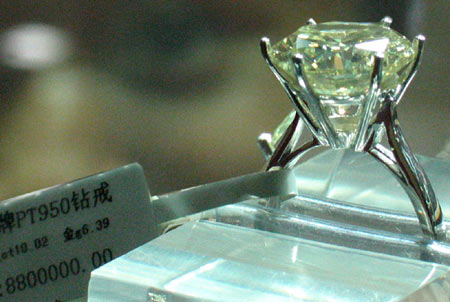 一颗重量达到10克拉的巨钻出现在南京中央商场内,尽管商场方面并没有刻意宣传,但是,其硕大的身躯、闪烁的金色光芒,再加上一旁高达880万元的标价签,却立即引来了无数的眼球。