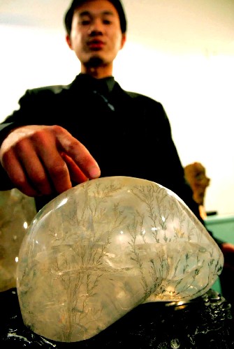 在北京举行的“2004中国国际珠宝展”上,一件产地在巴西酷似人脑的天然水晶石格外引人注目。晶体中的水草清晰可见。商家为这只水晶石标价为80万元人民币。