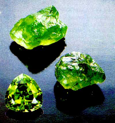 橄榄石 橄榄石因其颜色多为橄榄绿色而得名。其英文名称为Peridot或Olivine,前者直接源于法文Peridot,后者为矿物学名词。橄榄石大约是3500年以前,在古埃及领土圣·约翰岛发现的。