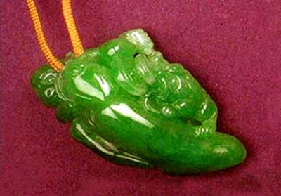 翡翠是一种以硬玉为主的纤维状、致密块状的钠铝硅酸盐矿物集合体,化学分子式为NaAl(Si2O6)。硬玉是自然界中最常见的造岩矿物之一辉石族中的一种少见品种,属单斜晶系。晶体形态为短柱状、纤维状微晶集合体。翡翠的颜色千变万化,多为绿、红、紫、蓝、黄、灰、黑、无色等。根据绿色的色调、亮度和饱和度,翡翠可分为祖母绿色、苹果绿色、葱心绿、菠菜绿、油绿、灰绿6种。玻璃光泽至油脂光泽,半透明至不透明。折光率1.66~1.68,双折射率0.012~0.020,无多色性。硬度6.5~7,密度3.25~3.4g/cm3。韧性极强。