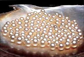 珍珠是一种古老的有机宝石,产在珍珠贝类和珠母贝类软体动物体内,由于内分泌作用而生成的 含碳酸钙的矿物(文石)珠粒,是由大量微小的文石晶体集合而成的。珍珠的化学组成为: CaCO391.6%,H2O和有机质各4%,其他0.4%。