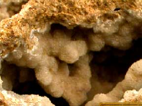菱锌矿 菱锌矿化学组成ZnCO3;ZnO 64.90%,CO2 35.10%;鉴定特征以其形态、产状及其粉末加冷盐酸起泡为鉴定特征,与本亚族其他矿物的区别在于比重较大,菱面体解理较不完全;产于铅锌矿床氧化带,是由闪锌矿氧化分解所产生的硫酸锌,交代碳酸盐围岩或原生矿石中的方解石而成,常与孔雀石、蓝铜矿等次生矿物伴生。
