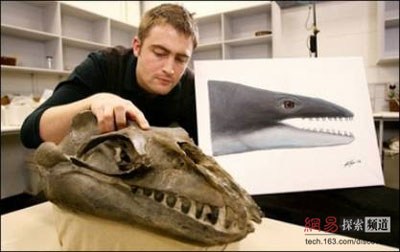 据路透社16日报道,最近,澳大利亚科学家发现了一种长有锋利牙齿的看起来十分凶残的海洋动物化石,通过对这些化石研究发现,当今生活在海洋中的那些没有牙齿的巨大蓝鲸的祖先并不是一种温柔的庞然大物,而是一种有着锋利牙齿的体型较小的鲸鱼。