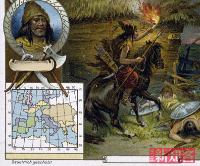会战的结果,匈奴输了这一回合。失利的匈奴首领阿提拉以马鞍堆起小山,小山上挤着嫔妃,堆满金银珠宝,阿提拉端坐其间,这真有些破釜沉舟的感觉——一旦彻底战败,阿提拉将与珠宝和嫔妃一起自焚。阿提拉有着典型的匈奴人的外形,宽阔的臂膀上顶着一颗硕大的头颅,面色黝黑,胡须粗硬,鼻子扁平,一对鹰一般的小眼睛让人不寒而栗。和那些简单粗暴的蛮族首领不同的是,阿提拉不但是一位能征善战的将军,还是一位出类拔萃的-家。在与罗马人大会战的16年前,也就是公元435年,阿提拉杀了自己的哥哥,夺取了匈奴的最高统治权。
