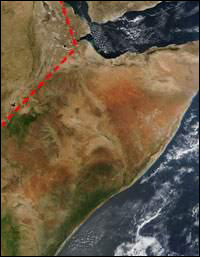为此,他们邀请了一些英国学者利用卫星技术来帮忙。根据观测结果,研究小组发现,发现在非洲东北部的阿法尔沙漠中,一个新的大洋正在形成。欧洲宇航局Envisat卫星发回的照片显示,一条37英里长、8米宽的巨大裂缝正在地壳深处逐渐显现出来。