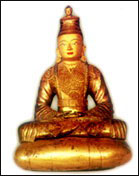 松赞干布坐像,高38厘米。此像身着翻领大袍,雕刻团龙花纹,全跏跌坐在圆垫上,禅定姿态,面容英俊年轻,器宇轩昂。缠头高冠中露出阿弥陀佛小像。阿弥陀佛作顶髻是观音菩萨的标志,也是松赞干布形象特征,俗称双头王,表明他是观音的化身。藏族艺术家以佛教菩萨形象塑造松赞干布敬奉如神,表达对这位民族英雄的憧憬,造像年代如与布达拉宫法王洞松赞干布塑像相比是较晚期的作品。