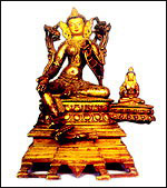 绿救度佛母像,高32.5厘米,西藏14世纪作品。绿度母戴独叶珠宝冠,神态庄严和悦,耳佩大耳铛,束发冠戴在耳两侧翻卷,袒露上身,佩带项链、臂钏。其丰乳细腰,肌肤圆润,左手握莲花茎,右手施与愿印,两肩旁雕盛开的莲花,花茎弯曲粗壮,左腿盘曲,右腿伸出踏小莲花,身躯略侧扭,体态优美典雅。白度母、绿度母,亦是观音菩萨的化身,是藏传佛教中形象最秀丽的女神,深受敬奉,是藏传佛教中的重要题材,所以传世的白度母、绿度母铜像数量众多。西藏民间传说松赞干布的两位王妃尼泊尔赤尊公主、大唐文成公主,是两位度母的化身,得到藏族人民永久的爱戴与怀念。在布达拉宫、大昭寺以及众多的寺院殿堂中都可看到她们的塑像。藏传佛教诸神中女神众多,藏族艺术家们把对人体的审美标准运用在佛母的塑像上,大胆表现女性的人体之美。