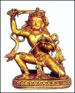 不动金刚,高26厘米,是不动佛的愤怒化身。其右臂高举利剑,左臂弯曲手握金刚索头,金刚索在臂上缠绕成圆环形,身体下蹲,左腿曲跪,立即跃起战斗的姿势,身躯壮硕充满活力,横眉怒目,威风凛凛,成功的刻画出护法神内在的强烈动感,无坚不摧的威力,是西藏15世纪的优秀作品。