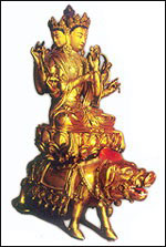 积光佛母,高29厘米,三头八臂,全跏跌坐于莲台上,有一头大猪驮载,造型奇特。积光佛母也称摩利支天,本是印度教中猪首人身的光明女神,摩利支即“威光”、“阳焰”之意,也译称“作明佛母”,她后为藏密所吸纳,变为三面八臂的独特造型。此像三面中的一面多为猪脸,表明女神的原始身份,佛母面容端庄丰满,具有汉地佛像特征。其八臂各持金刚杵、弓、无忧树枝、金刚索、线等法器。佛母上身赤裸,胸前装饰华丽的项链璎珞,写实的衣褶起伏自然,精雕细刻镀金亮丽,是汉藏佛像艺术的完美结合。此像1992年曾在故宫博物院展出,莲座后刻有“大明永乐年施”题记,是明代永乐时期宫廷作品。响铜殿内收藏了多尊永乐宣德年宫廷制作的藏传佛像,极为精美。