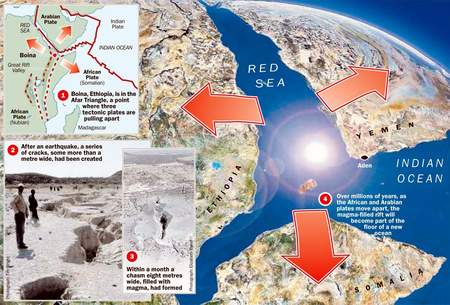 地质学家们确定,新裂口里面全是流动的岩浆,岩浆从位于裂口北端的两个火山下方流出,最后将变硬。科学家们预测,阿法尔地区这一现象还只是刚刚开始,当断面发展到达红海时,海水就会淹没这一地区,于是,新的大海甚至大洋就会诞生。不过,这一过程需要数百万年。