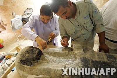 2006年6月28日,在埃及卢克索帝王谷一处新发现的古迹发掘现场,埃及考古工作者在清理木棺。