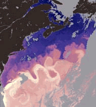 墨西哥湾流的暖水流过美国东海岸的冷水。