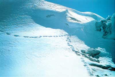 红雪之谜 喜马拉雅山5000米以上的冰雪表面,常点缀着血红色的斑点,远看如同红雪。这些红斑点是由雪衣藻、溪水绿球藻和雪生纤维藻等藻类组成的。在永久性冰雪中,高原藻类分布广,耐寒性强,零下36度也不至于死亡。因其含有血色色素,故呈红色